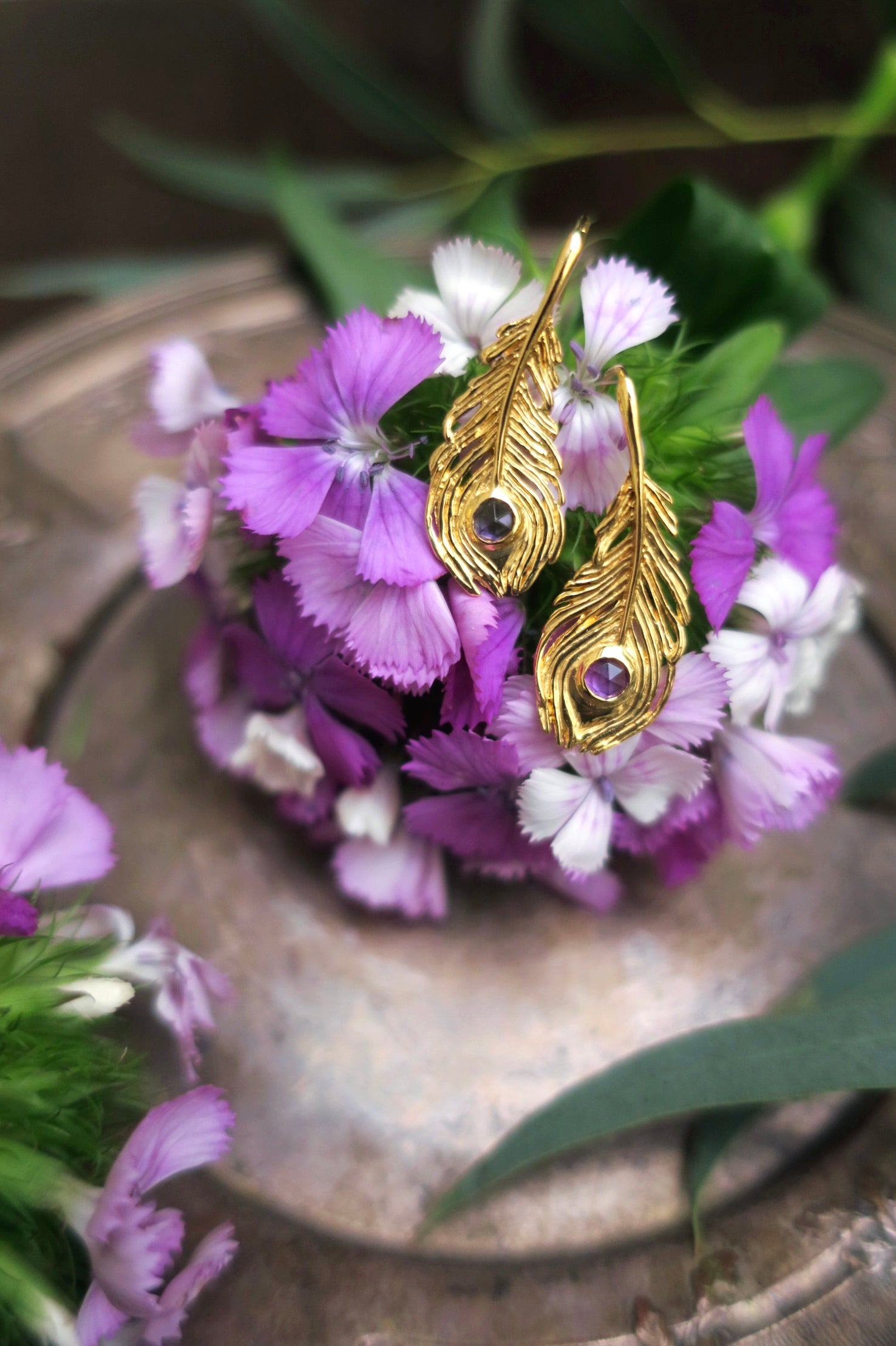 Piercings motif plume de paon avec 2 améthystes taille rose, en argent 925 18KGP, fabriqués à Paris.